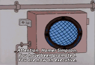 Attention, Homer Simpson. You have been promoted. You are now an executive. Take three minutes to say good-bye to your former friends... and report to room 503 for reassignment to a better life.