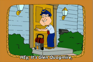 HEy, It's Glen Quagmire, the wacky next- door neighboR. What's he up to this tiME? I'm going to work!