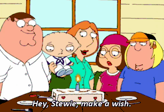 Hey, Stewie, make a wish. If you blow out the candle, it'll come true. That's right, little buddy. What do you want most in the whole world? In the whole world, you say? Oh, What the hell.