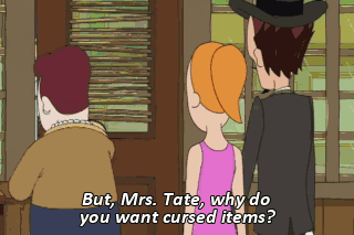 But, Mrs. Tate, why do you want cursed items? Well, I'm going to get the curses removed at "Curse Purge Plus." You know, the guy on TV? What?