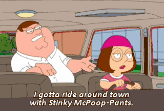 I gotta ride around town with Stinky McPoop-Pants. I want apple juice. Dad, you left your apple juice at home. I want apple juice! - You wanna watch SpongeBob? - Yes. With apple juice.