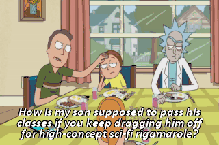 How is my son supposed to pass his classes if you keep dragging him off for high-concept sci-fi rigamarole?