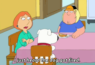 I just heard the dog got fired. Did I miss it? Did he cry yet? Oh, come on, dog. Cry for me. There, there you are. Oh, yeah. Cry for Stewie. Life isn't what you thought it would be.