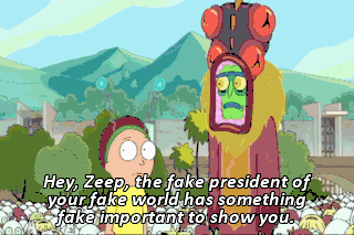 Hey, Zeep, the fake president of your fake world has something fake important to show you. MAN: It's not much now,