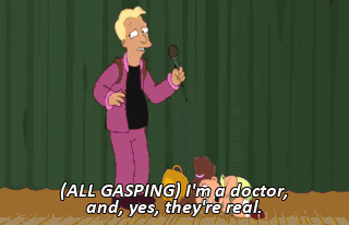 (ALL GASPING) I'm a doctor, and, yes, they're real. (DEFIBRILLATOR WHINING) Clear! (LAUGHING)