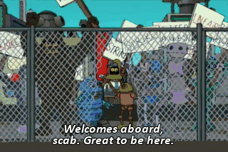 Welcomes aboard, scab. Great to be here. Come on. I'll introduces you to your scab coworkers you'll be scabbin' with.