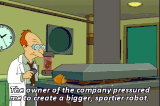 The owner of the company pressured me to create a bigger, sportier robot. Stop! Ow! Oh! It wasn't easy, but by sacrificing fuel efficiency, I succeeded.