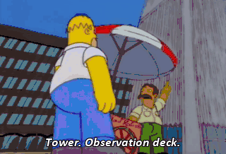 Tower. Observation deck. Oh! But I can't leave my car until the parking guy gets here. Oh! Why did I drink all that crab juice? Hmm! Don't even think about it, pal!