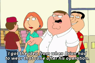 I got the idea from when Brian had to wear that cone after his operation. Okay, ifl make this, we're all gonna get laid. Yes! Score! Score! BRIAN: Boy, I'd really like to chew on my crotch right now.