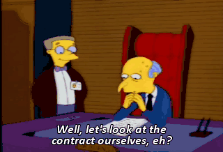 Well, let's look at the contract ourselves, eh? Benefits, perks, a green cookie on St. Patrick's Day? Oh-ho, it didn't use to be this way, Smithers. No, it didn't use to be this way at all.