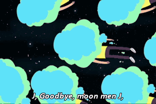 J, Goodbye, moon men J, J, You say goodbye, moon men J, J, Goodbye -- J, Shut the fuck up about moon men! This isn't a musical number.