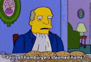You call hamburgers steamed hams? Yes. It's a regional dialect. Uh-huh. Uh, what region? Uh, upstate New York.
