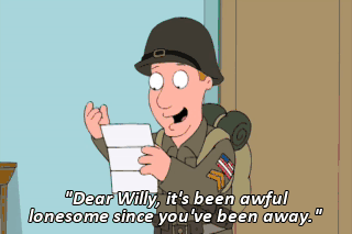 "Dear Willy, it's been awful lonesome since you've been away." Hey, you hear that, fellas? She misses me! (LAUGHING) You're all wet.