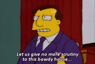 Let us give no more scrutiny to this bawdy house... and its small clientele of loyal perverts. Oh, I'm afraid this problem goes far beyond Eugene and Rusty. Marge, if you please.