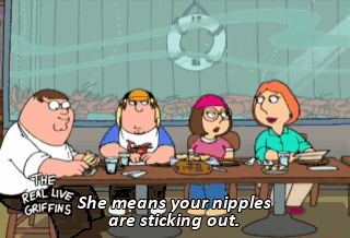 She means your nipples are sticking out. Mom! Nipples! Nipples! That's it! I want those cameras ofF! 4th wall! You're breaking the 4th wall!