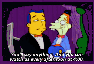 You'll say anything. And you can watch us every afternoon at 4:00. That's the same time as Krusty the Clown! Uh-oh. That cute little character could take America by storm. All he needs is a hook.