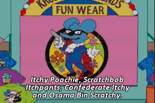 Itchy Poochie, Scratchbob Itchpants, Confederate Itchy and Osama Bin Scratchy.