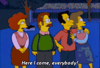 Here I come, everybody! What are you doing, Marge? Didn't you hear the song? No, I had to go rent the bulldozer. Well, we all changed our minds.
