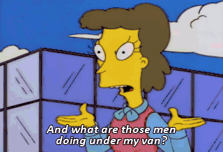 And what are those men doing under my van? Look, lady, if I was you, I would just leap into the air, as I'm preparing to do.