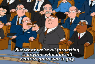 But what we're all forgetting is anyone who doesn't want to go to war is gay. I want to go to war. (All) Oh, yes, yes, yes. We should definitely go. (All) Yes, we should totally go to war.