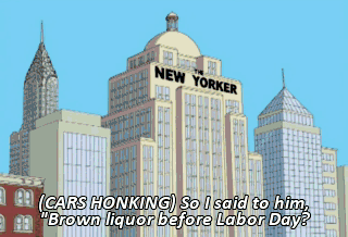 (CARS HONKING) So I said to him, "Brown liquor before Labor Day?