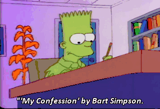 "'My Confession' by Bart Simpson. "I am a regular dumb kid. Period. I cheated on my intelligence test. Period." Ah, finished already ? Principal Skinner will be very interested to-- to--