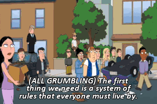 (ALL GRUMBLING) The first thing we need is a system of rules that everyone must live by.