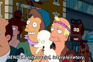 BENDER: Interracial, interplanetary, even ghost and horse, but not robot and human! (ALL BOOING) (BOOING) That's why we're introducing this ballot initiative to legalize robosexual marriage! ALL: Yeah!