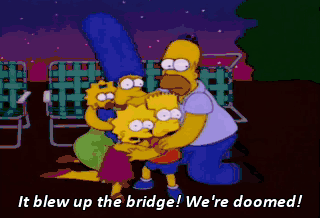 It blew up the bridge! We're doomed! It's times like this I wish I were a religious man. It's all over, people! We don't have a prayer!