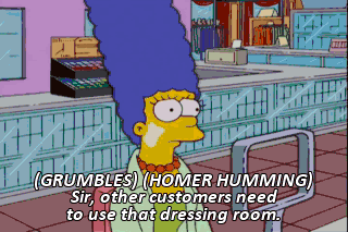 (GRUMBLES) (HOMER HUMMING) Sir, other customers need to use that dressing room. Dressing room? Uh-oh.