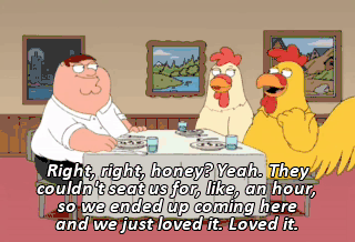 Right, right, honey? Yeah. They couldn't seat us for, like, an hour, so we ended up coming here and we just loved it. Loved it.