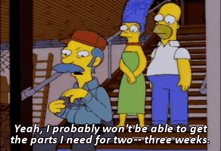 Yeah, I probably won't be able to get the parts I need for two-- three weeks. And that's if I order 'em today-- which I won't. Oh, dear.