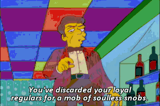You've discarded your loyal regulars for a mob of soulless snobs. Well, at least the tips are good. Are they, Moe? Take a look. Oh! Why you mocking me? We're friends. Oh, right. Sorry. I won't drink at Moe's