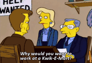 Why would you want to work at a Kwik-E-Mart? Well, uh, to be honest, in my upcoming movie... I'm gonna be playing this tightly wound convenience-store clerk,