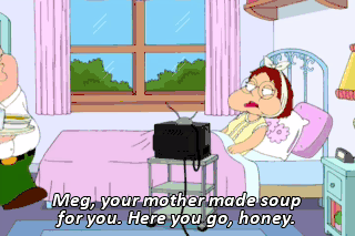 Meg, your mother made soup for you. Here you go, honey. (SCREAMS) Well, you know who does love you? The Lord. PETER: Here's your milk. Rupert, my transporter is complete.