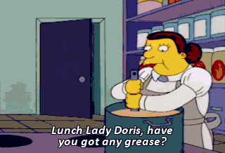 Lunch Lady Doris, have you got any grease? Yes. Yes, we do. Then grease me up, woman! Okeydokey.