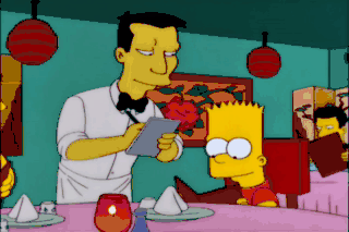 Uh, yeah. I'll have the shark butt with butt sauce. Bart! Oh, excellent choice, sir. Oh!