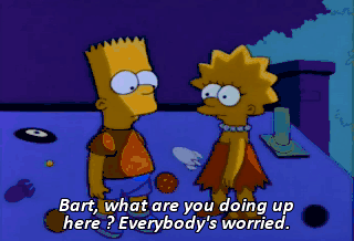 Bart, what are you doing up here ? Everybody's worried. - Really ? Did they cry ? - Yes. Whoa, bull's-eye. Bart, why did you burn my centerpiece ?