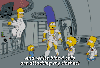And white blood cells are attacking my clothes! Although I must admit they know where to stop. We'll have to lighten the ship, which means one of us has to stay behind.