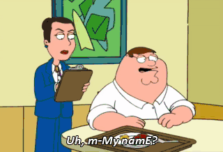 Uh, m-My namE? Uh, uh... Uh, uh... "Pea" uh, uh, uh... "tear" uh, uh... "Griffin." Yeah, yeah. Peter Griffin. Oh, craP.