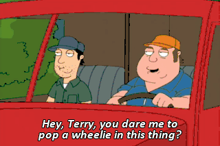 Hey, Terry, you dare me to pop a wheelie in this thing? That doesn't sound safe at all, but, okay, I dare you. Wow! That was great!
