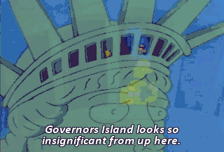 Governors Island looks so insignificant from up here. Hey, immigrants, beat it! Country's full! Okay, folks. You heard the lady. Back into the hold. We'll try Canada.