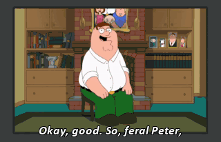 Okay, good. So, feral Peter, why don't you put in tape number two and let's get started. Don't listen to that Peter! That Peter is a liar! Run! Be free! They will enslave you! (GRUNTING) (GRUNTING) (BOTH GRUNTING)