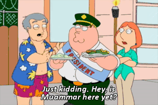 Just kidding. Hey, is Muammar here yet?