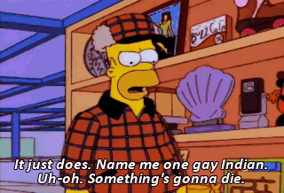 It just does. Name me one gay Indian. Uh-oh. Something's gonna die.