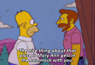 The nice thing about that place is Mary Ann gets in the hammock with you. - I'm just kidding. - Oh. You know who invented the hammock, Homer? No. That's something for you to do. Find that out.