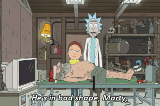 He's in bad shape, Marty, Aw, geez, Rick. What'd you do? Gee, thanks, Morty. W-w-what kind of monster do you think I am? l-l-l'm sitting here trying to save the guy's life. I need your help.