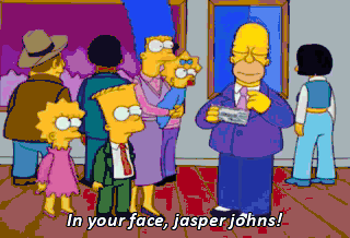 In your face, jasper johns! Huh? Where you going with that junk, Dad? I'm gonna be an outsider artist. That way I can turn all these old baseball cards, Disney memorabilia...