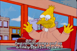 Two ration stamps and an artillery shell full of oleo! What's your nostalgia prize, Grampa? Liberace action figure! Party tonight at Roddy McDowall's. Whoo. I got a plastic Krusty-saurus. Hmm.