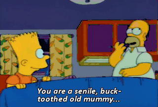 You are a senile, buck-toothed old mummy... with bony girl arms, and you smell like-- - An elephant's butt ? - Hee-hee. An elephant's butt.